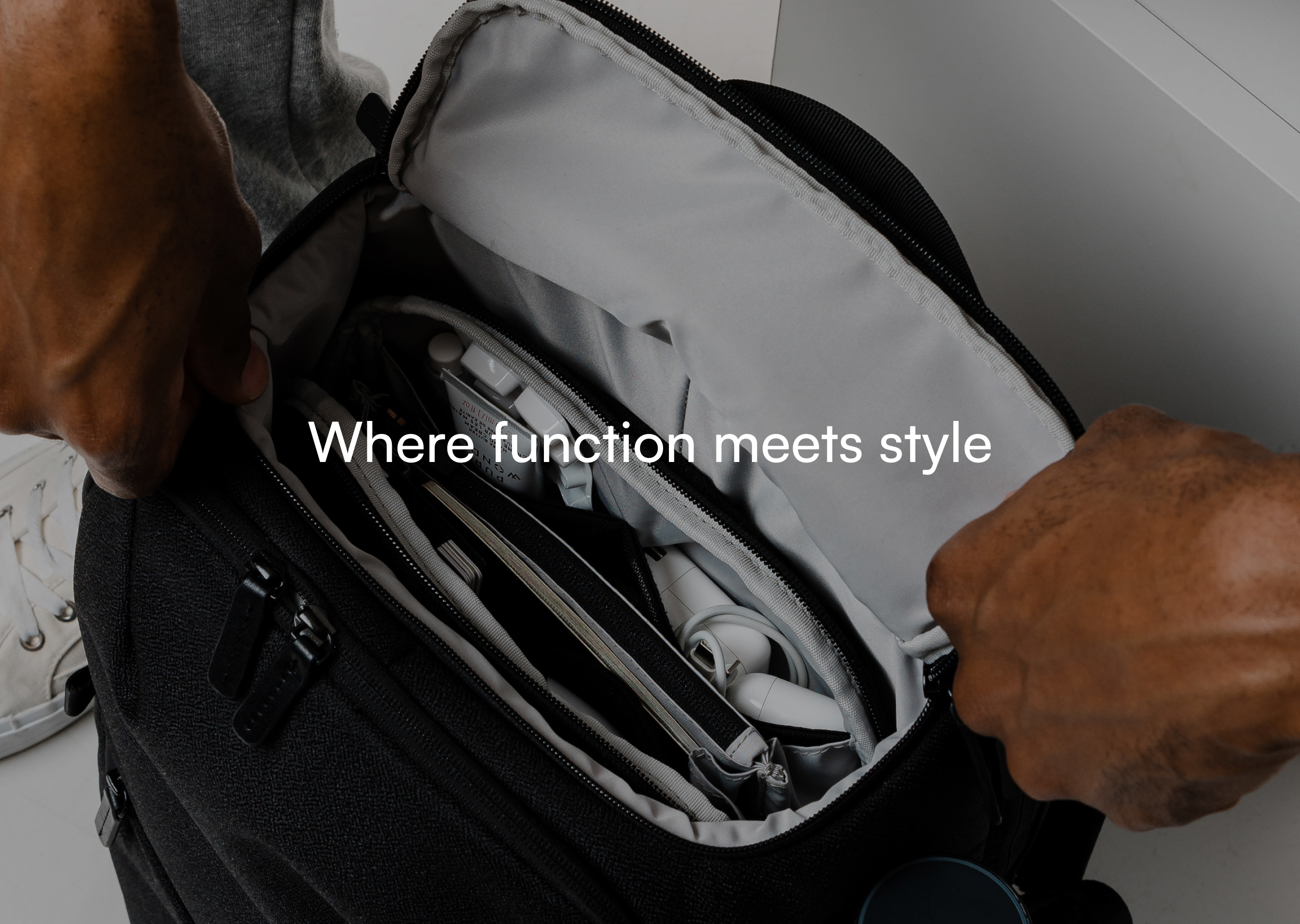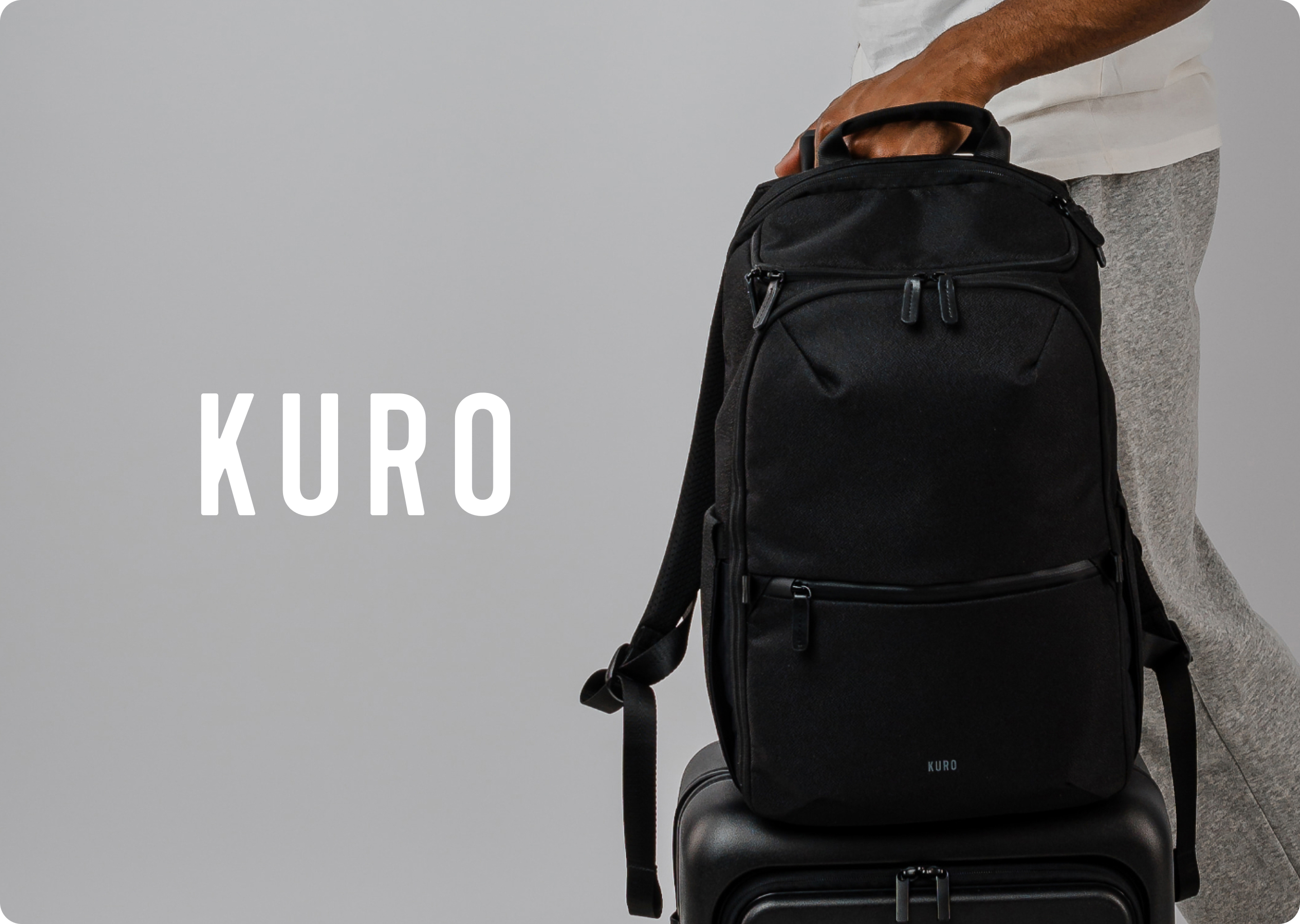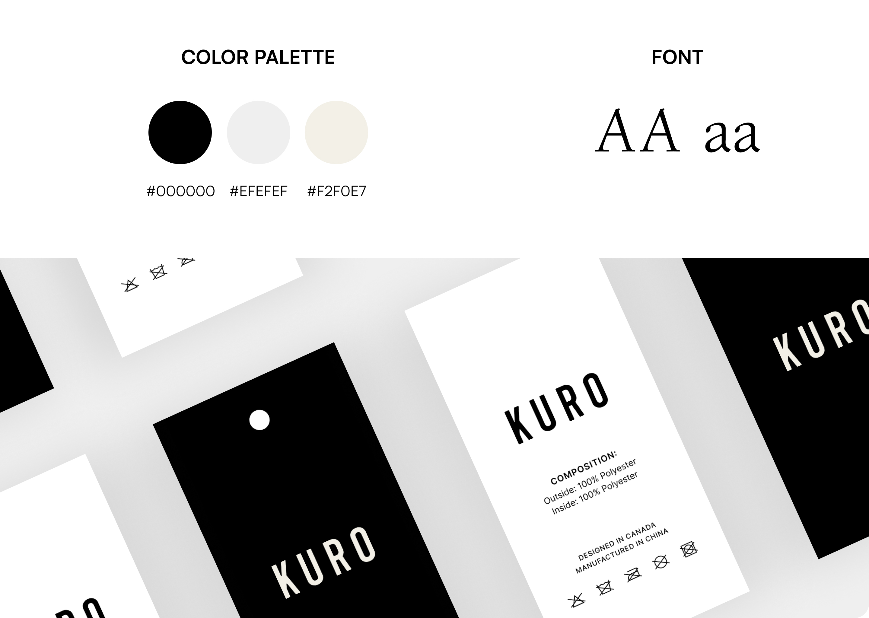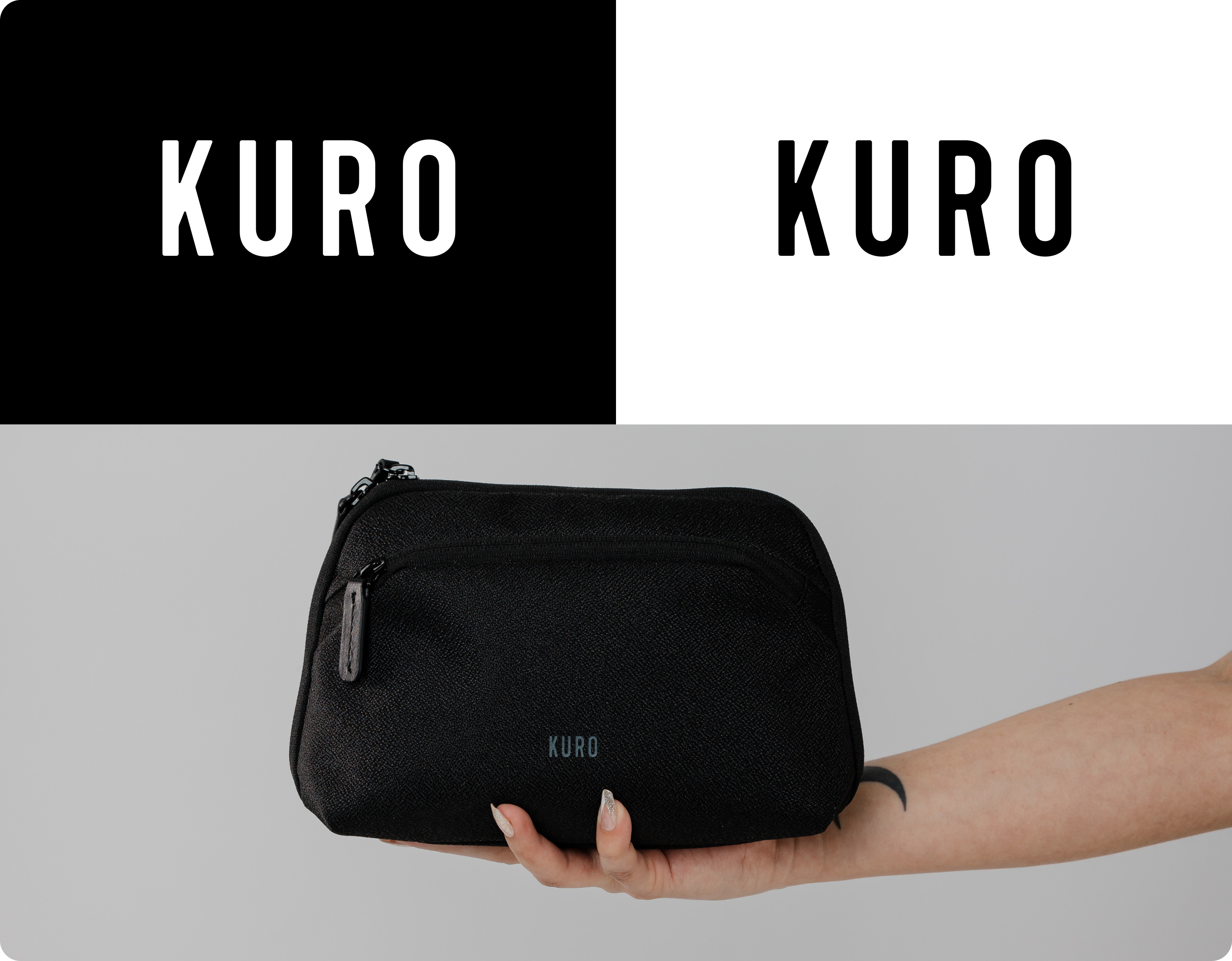 The Kuro logo is designed to be bold, simple, and highly adaptable, ensuring visibility and recognition across different applications. It is prominently displayed on the bag tag, subtly reinforcing brand identity while maintaining a sleek and understated look. The monochromatic color palette further enhances the premium feel, ensuring the brand exudes luxury and minimalism.